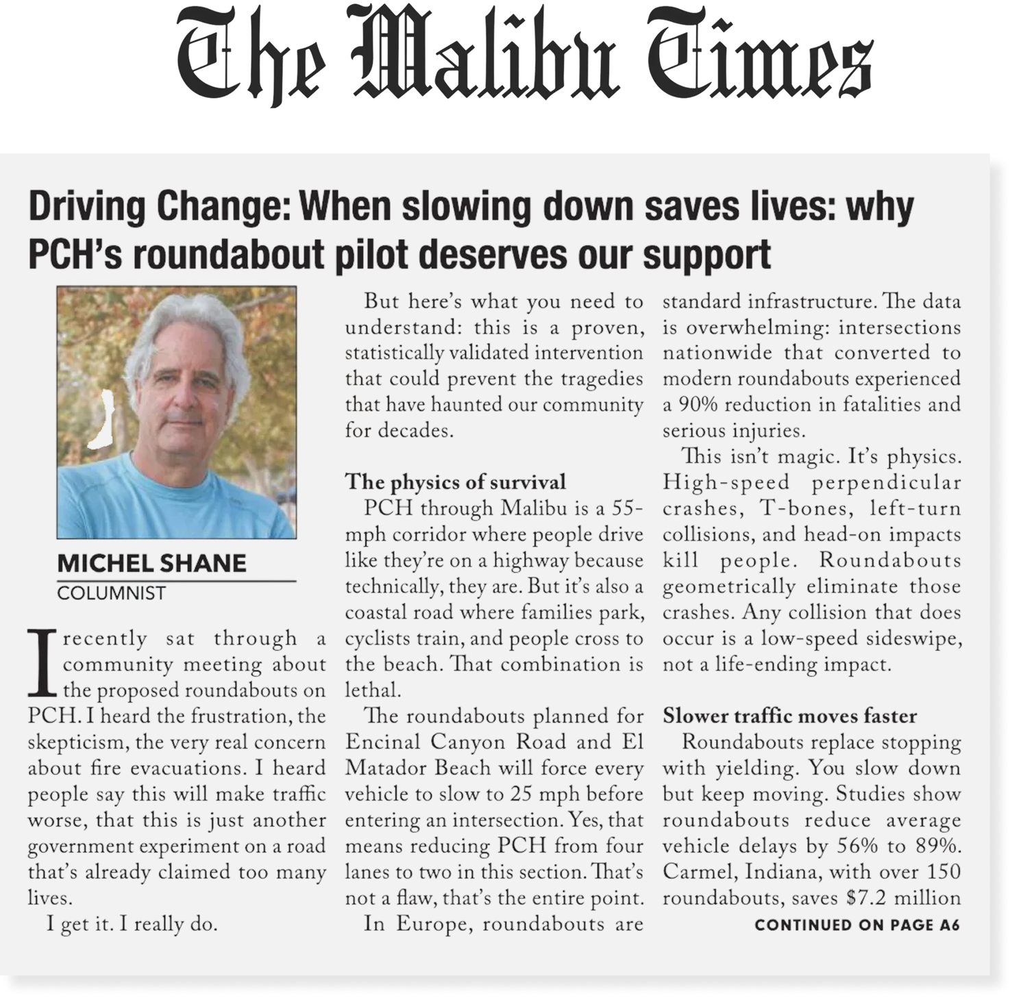 Every two weeks, Michel Shane's "Driving Change" column appears in The Malibu Times , serving as both commentary and call to action.